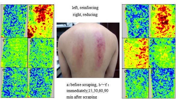 2.首次从生物学基础角度揭示刮痧“活血通络”物质基础和外周效应规律:通过对家兔、大鼠和人体的刮痧,发现不同手法刮痧均对体表温度和血流灌注量有升高变化,且对穴位、同侧经脉上具有相同效果,为“循经刮痧”提供科学依据。采用荧光免疫组化和Western blot技术,开展“痧”的生物学定性、定量研究,观察对神经元型一氧化氮合酶、5-羟色胺、组胺等8种活性物质表达变化以及表皮、毛囊、血管组织和神经纤维形态有无改变,揭示“痧”的本质,评价安全性和临床刮痧间隔。