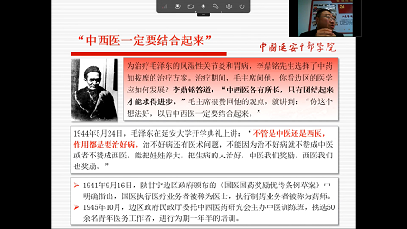 同时,薛教授对我党推动中西医结合的实践工作进行了详细讲解,如1944年5月24日,毛泽东同志在延安大学开学典礼上的讲话中指出:“不管是中医还是西医,作用都是要治好病”;1945年3月13日,陕甘宁边区成立了第一个中西医合作团体——中西医药研究会,促进了边区中西医的团结与合作,也进一步提升了边区医疗卫生工作的质量和水平。