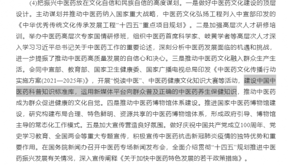 为贯彻落实《中共中央 国务院关于促进中医药传承创新发展的意见》文件精神,按照健康中国行动有关中医药任务的要求,2021年3月中华中医药学会启动了中国中医药科普标准知识库建设工作,该工作得到国家中医药管理局的支持和指导。10月24日,局党组公布了“中共国家中医药管理局党组关于十九届中央第六轮巡视整改进展情况的通报”,其中提到“把振兴中医药放在文化自信和民族自信的高度谋划”,并把建设中国中医药科普标准知识库作为方式之一