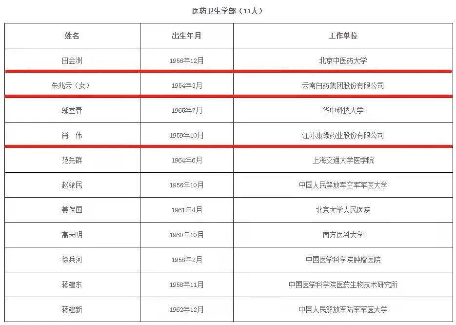 其中,中华中医药学会副会长肖伟、中华中医药学会脑病分会第四届委员会名誉副主任委员田金洲、中华中医药学会中药资源学分会第二届委员会名誉副主任委员朱兆云当选中国工程院院士。