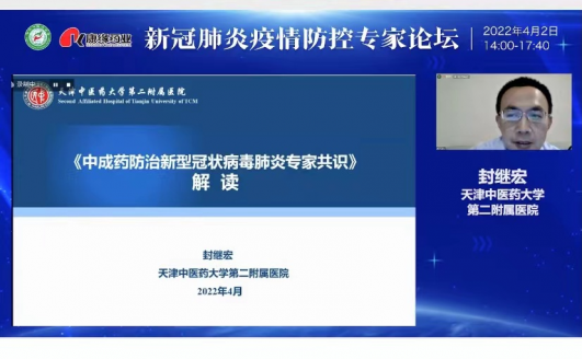 天津中医药大学第二附属医院呼吸科主任封继宏教授作《中成药防治新型冠状病毒肺炎专家共识》解读报告,封教授介绍了本次共识制定的背景、目的,对共识中的核心内容进行了解读,分享了天津在新冠肺炎疫情防控中的经验。