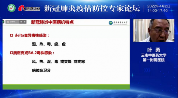 云南中医药大学第一附属医院重症医学科主任叶勇教授作《新冠肺炎预防经验分享》报告,分享云南德宏州瑞丽市新冠肺炎疫情防控经验,在预防、治疗和康复的各个环节,以中医药为主导、同时注重中西医协同。特别强调了防线前移,先症而治,截断病势,方随症变,重视无症状及轻症的防治,重视病程演变规律和核心病机变化特点,制定预防理法方药,重视中成药应用,这些经验对防治新冠肺炎具有重要意义。