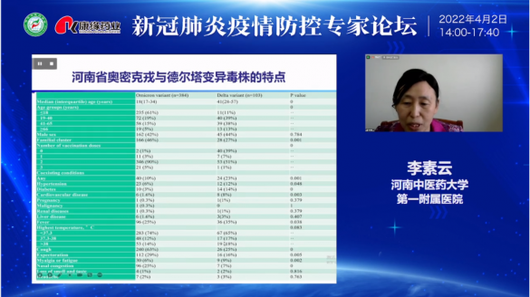 中华中医药学会肺系病分会副主任委员、河南中医药大学第一附属医院副院长李素云教授作《新冠肺炎治疗经验分享》报告,李教授介绍了新冠疫情全球发展情况、新冠肺炎中医证候分型,还重点分享了河南省奥秘克戎治疗经验,系统性的对比了河南省不同变异病毒株的不同特点及不同治疗方案。
