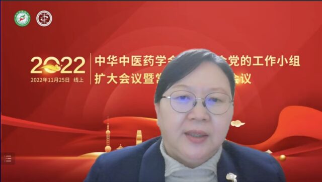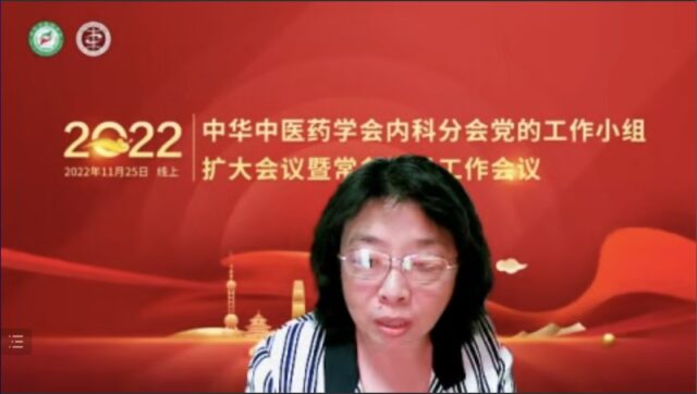 2022年11月25日晚,中华中医药学会内科分会党的工作小组扩大会议暨常务委员工作会议在线上顺利召开。中华中医药学会内科分会名誉主任委员孙塑伦教授,主任委员高颖教授,副主任委员刘中勇、李建生、赵建军、张军平、黄平、周亚滨教授,副秘书长张洪春教授等80余位党员委员及常务委员线上参会,中华中医药学会学术部主任庄乾竹列席会议。会议由内科分会秘书长常静玲教授主持。
