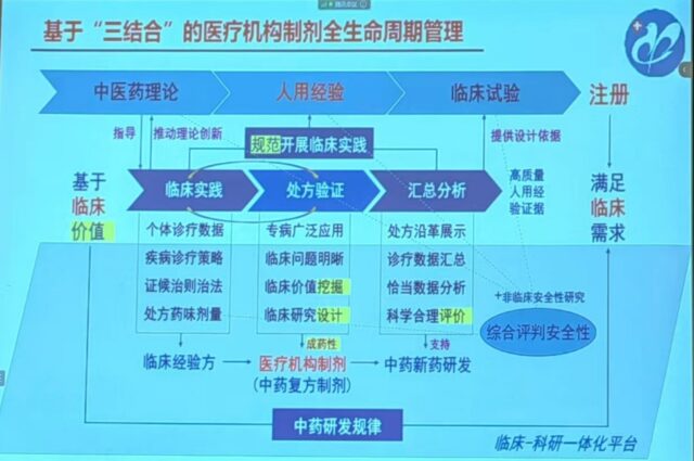 会上,北京中医药大学东方医院转化医学中心主任路遥围绕医疗机构制剂转化中药新药的优势和制约因素、如何畅通基于“临床经验方-医疗机构制剂-中药新药”的创新研发路径、基于“三结合”医疗机构制剂全生命周期管理体系的建立进行了介绍,并重点围绕北京中医药大学东方医院转化医学中心在制剂研发和成果转化方面形成的模式和机制作了分享。路遥表示医疗机构中药制剂的研发与转化是一项重临床、长规划、多部门、全周期的促进产业链与创新链融合的科技创新实例。一方面,医疗机构要加强对国家相关部门政策的普及和宣讲;另一方面,要重点面向临床未被满足的需求进行联合公关。