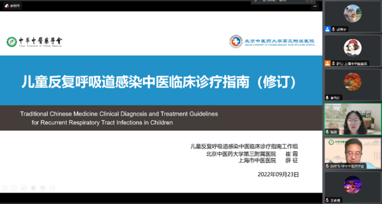 近日,由中华中医药学会立项,北京中医药大学第三附属医院、上海市中医医院共同牵头的《儿童反复呼吸道感染中医临床诊疗指南(修订)》专家论证会在线上顺利召开。国医大师、河南中医药大学第一附属医院主任医师丁樱,南京中医药大学主任医师汪受传、赵霞,天津中医药大学第一附属医院主任医师马融,云南中医药大学主任医师熊磊,北京中医药大学第三附属医院主任医师崔霞,中华中医药医学会标准化办公室负责人苏祥飞及来自广西中医药大学第一附属医院、北京中医药大学东方医院、辽宁中医药大学附属医院、湖南中医药大学第一附属医院、长春中医药大学附属医院、首都医科大学附属北京儿童医院、中日友好医院、北京大学第三医院、福建中医药大学附属人民医院、上海市中医医院、南京中医药大学附属医院、山西中医药大学附属医院、贵州中医药大学第二附属医院、云南中医药大学第一附属医院等20余位中西医儿科领域的专家参与了指南论证。会议由上海市中医医院主任医师薛征主持。