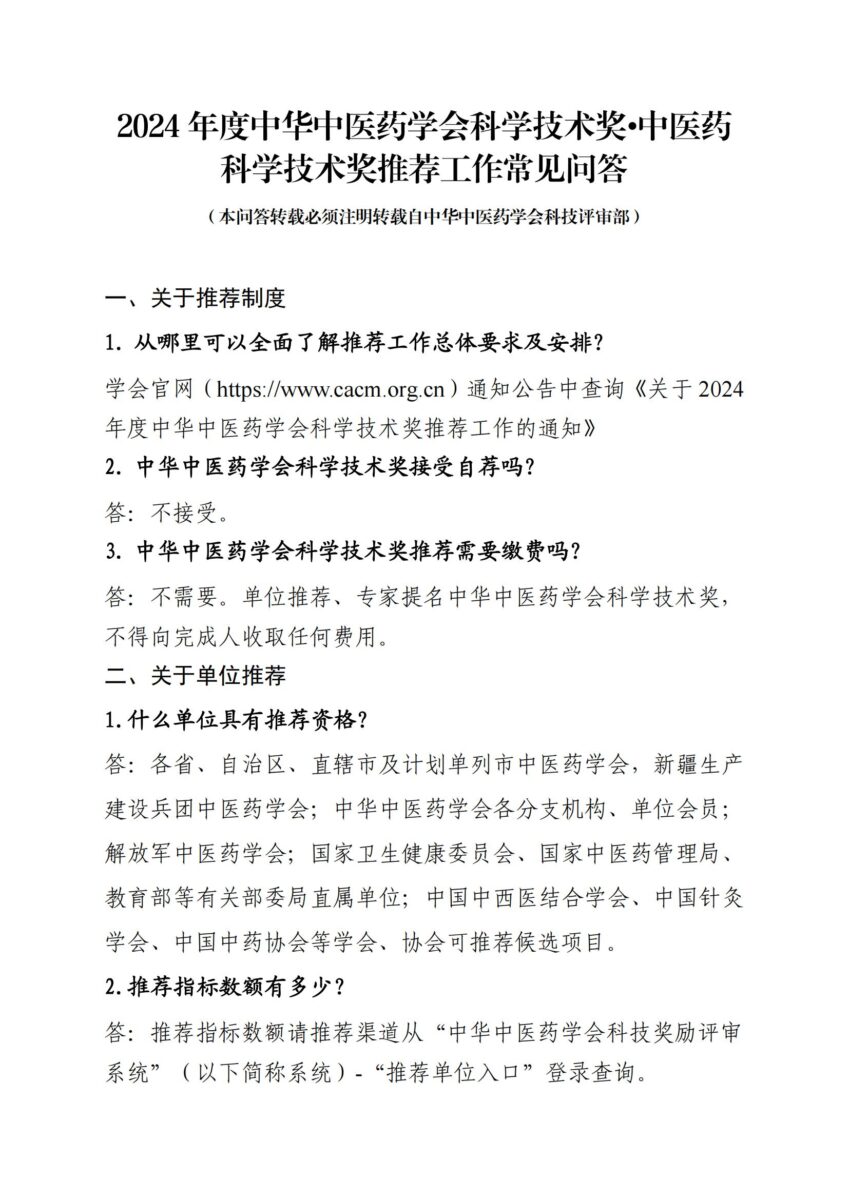 2024年度中华中医药学会科学技术奖•中医药科学技术奖推荐工作常见问答