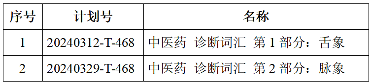按照国家标准制修订计划和制定有关要求,《中医药 诊断词汇 第1部分:舌象》(20240312-T-468)《中医药 诊断词汇 第2部分:脉象》(20240329-T-468)推荐性国家标准已完成起草工作,现进行征求意见。征求意见材料及意见可通过“全国标准信息公共服务平台”下载查看并反馈。如有相关问题,请通过以下方式与我们联系。